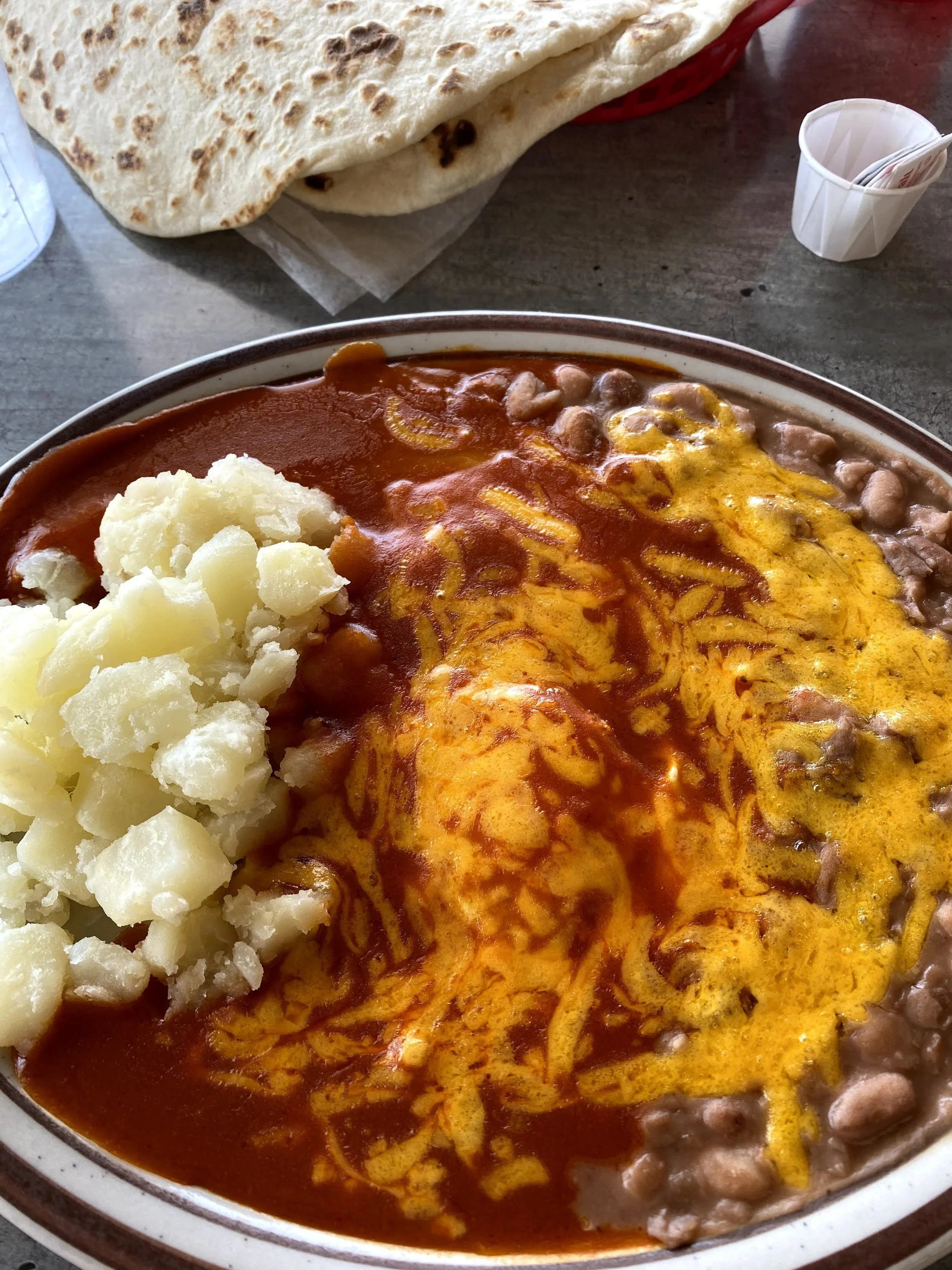 Red Chile Enchiladas, Beans, New Mexico Potatoes, Salad